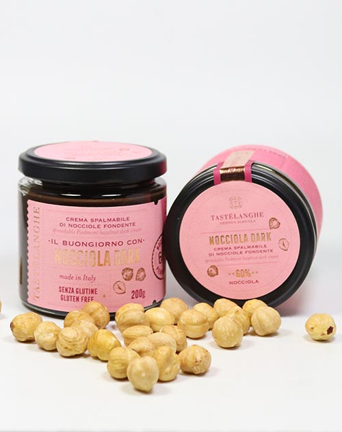 Haselnuss-Nougatcreme aus 60% besten piemonteser Haselnüssen (Nocciola Piemonte I.G.P.) und Zartbitterschokolade aus Riserva-Edelkakao