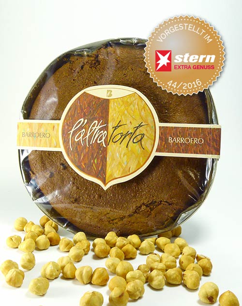 Haselnusskuchen mit dunkler Schokolade verfeinert – 52% piemonteser Haselnüsse I.G.P. – Ohne Mehl hergestellt! Empfohlen im STERN EXTRA GENUSS 44/2016