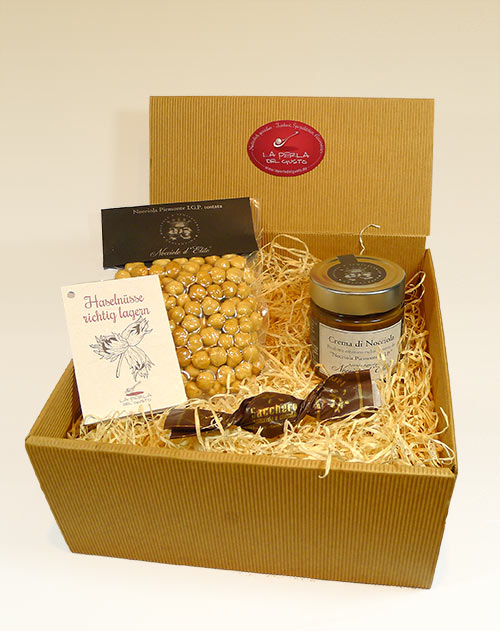 Geröstete Haselnüsse ‘Tonda Gentile I.G.P.’ (200g) Crema di Nocciole (250g) und eine Trüffel-Praline aus dem Piemont im schönen Präsentkarton.