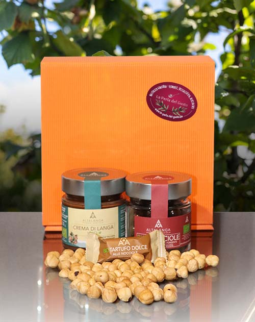 Ein Geschenkset aus Nussnougatcreme und frisch gerösteten Haselnüssen IGP von Barroero, Tartufo Dolce BIO von Altalanga und reinem Haselnussöl aus gerösteten Nüssen von NoccioleNatura aus dem Piemont
